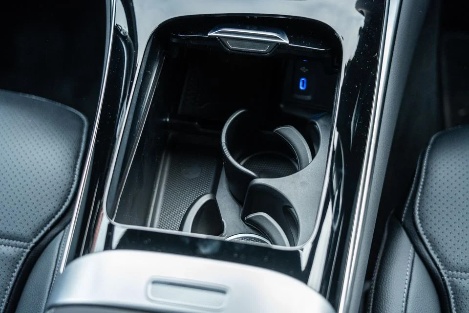 Otherwise, the cabin doesn’t do much more than what you see on the surface. Under the glossy sliding lid in the middle is a small storage cubby with two cupholders, a wireless phone charger, and two USB-C outlets.